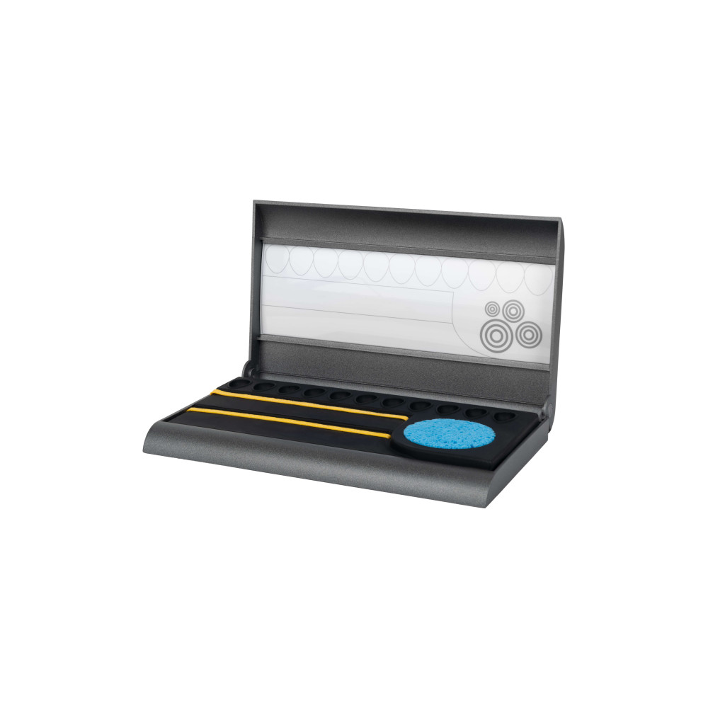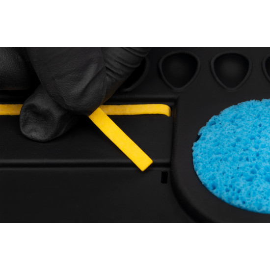Wählen Sie zwischen der Arbeit auf einem Nylonblatt oder mit den synthetischen Streifen. Elf Farbmulden sind der Speicher für Ihre Lieblingsfarben.