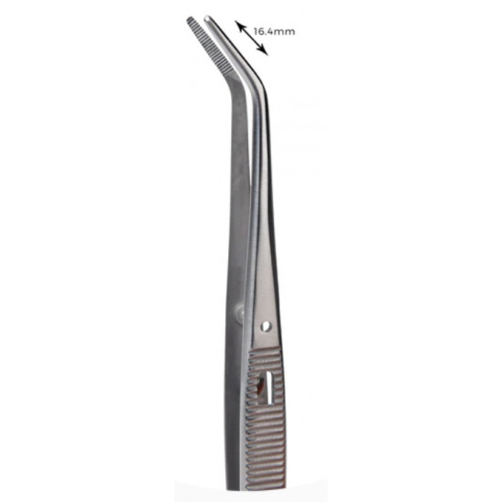 Abgewinkelte Pinzette mit Verriegelung, eignet sich zum Halten von Nahtmaterial, Kohlepapier für die Bissregistrierung und für allgemeine Zwecke in der Klinik oder im Labor.