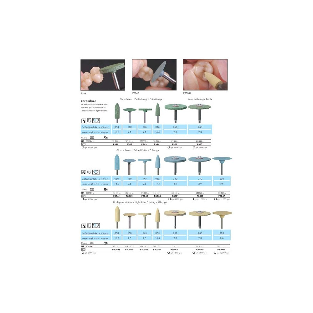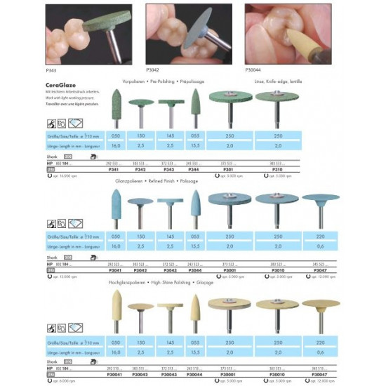 Das 3 Stufen Poliersystem eignet sich perfekt für alle Keramikmassen, einschließlich Zirkondioxid, die im zahntechnischen Labor zum Einsatz kommen, aber auch für NEM-Legierungen und Titan. Auf diesen Legierungen entstehen in kürzester Zeit hochglänzende Oberflächen.