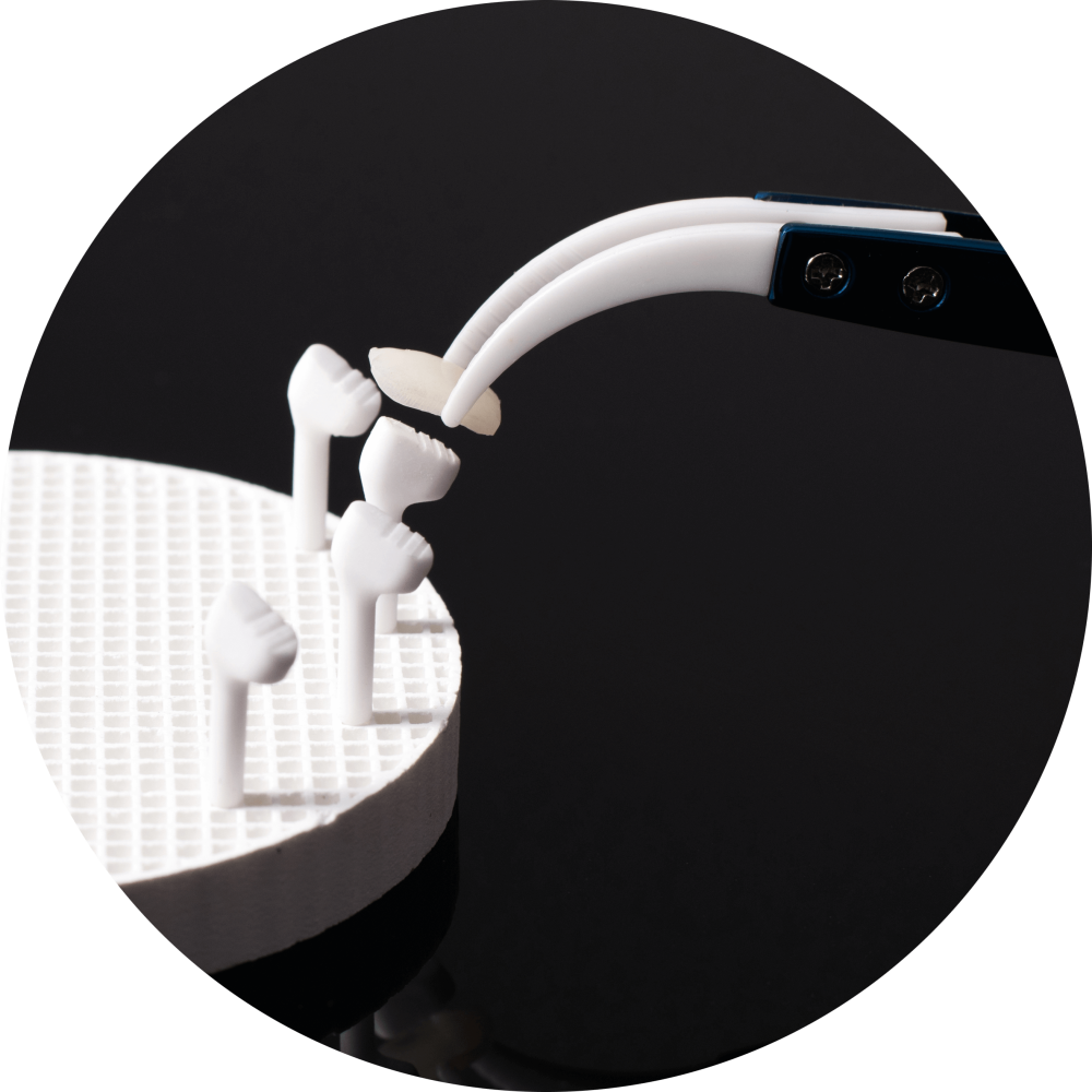 Die Enden dieses Halters bestehen aus gesintertem Zirkonium und sollen Porzellan dabei unterstützen, Kronen, Veneers und Brücken leicht auf dem Träger zu platzieren.
